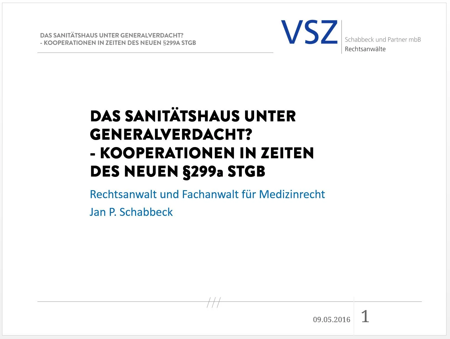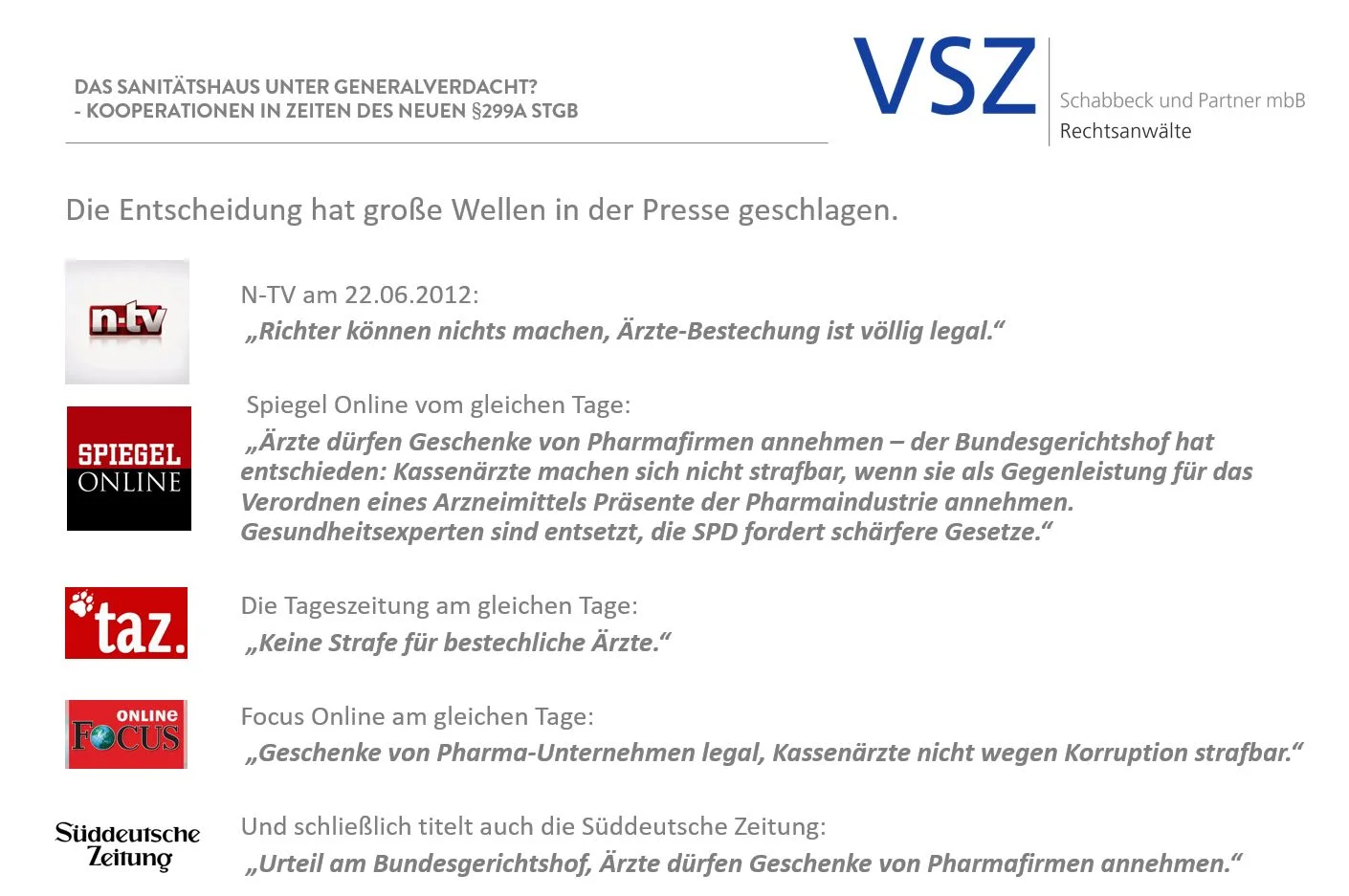 Rechtsanwalt Schabbeck wies dabei zunächst darauf hin, dass der Bundestag am 14.04.2016 ein Gesetz verabschiedet hat. Es sei nunmehr damit zu rechnen, dass § 299a StGB bald eingeführt wird. Dies sei nur noch eine Frage der Zeit.